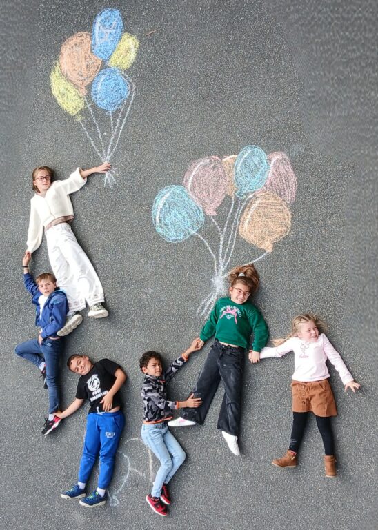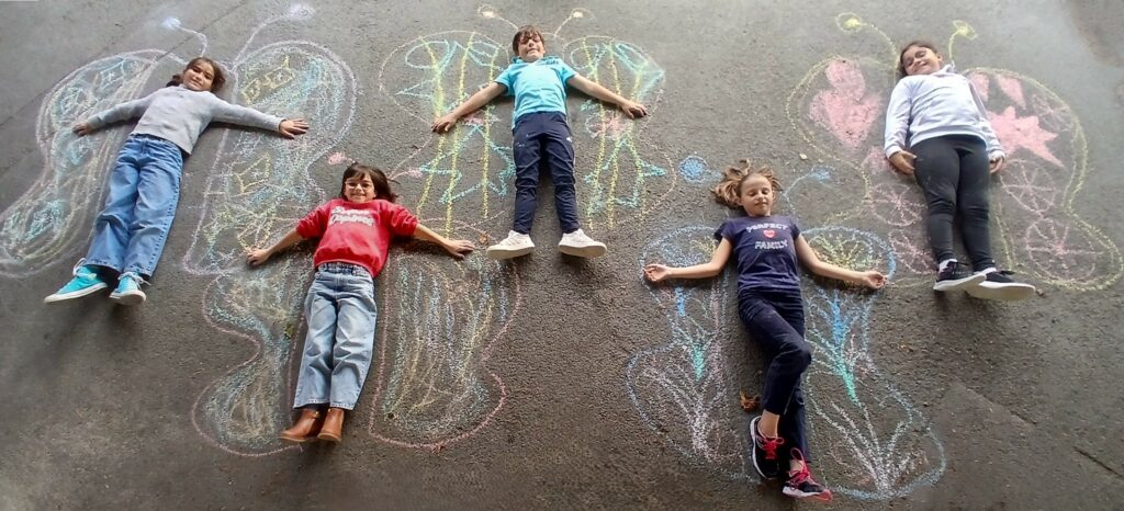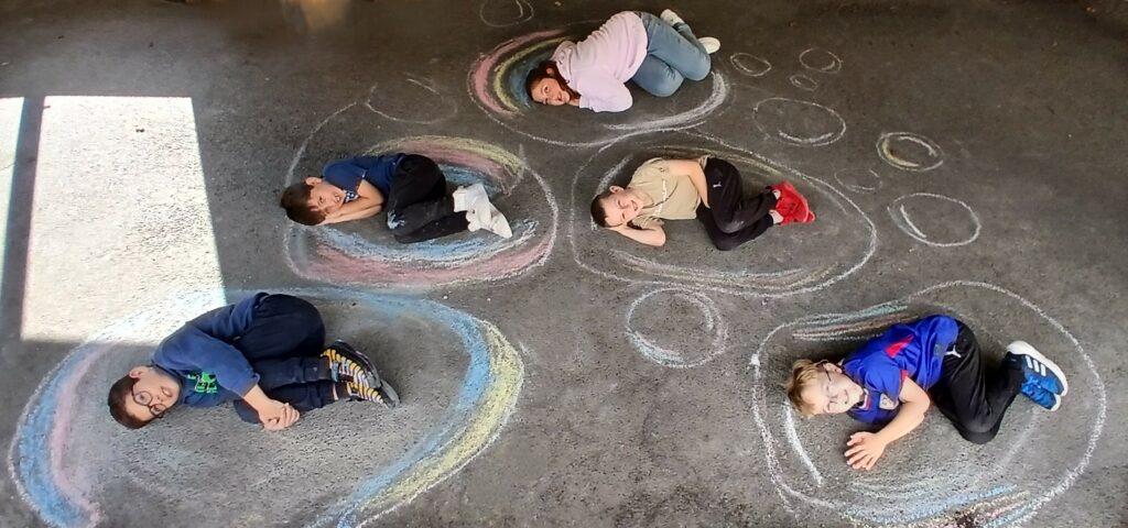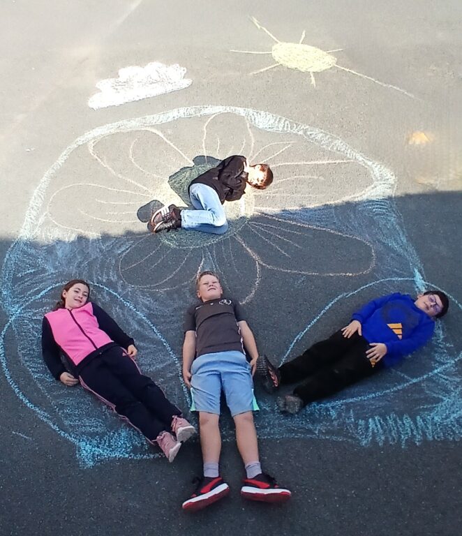 En arts plastiques, nous avons utilisé des craies pour créer un décor où poser ! Nous avons réfléchi à des endroits, des situations où le calme et la sérénité règnent: