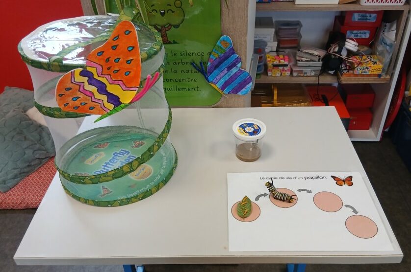 Nous avons installé un élevage de chenilles dans la classe dans le cadre des séances de sciences. Grâce à des observations régulières, nous découvrons l’anatomie de la chenille, sa manière de se déplacer et ses besoins pour grandir.