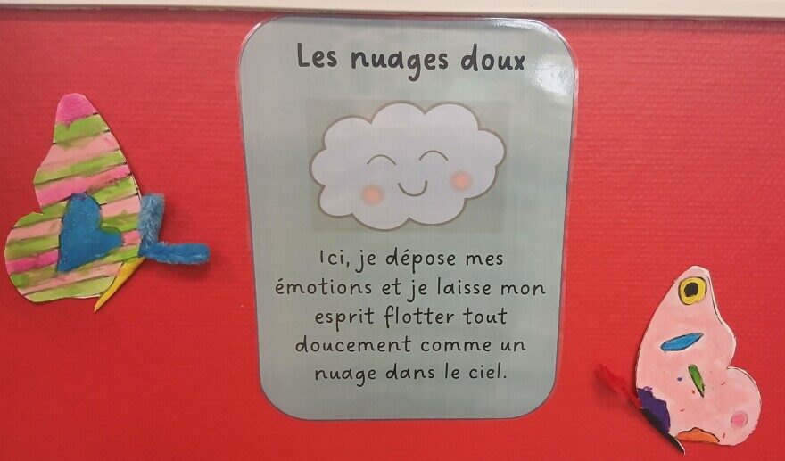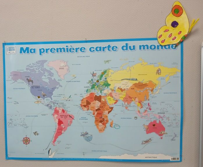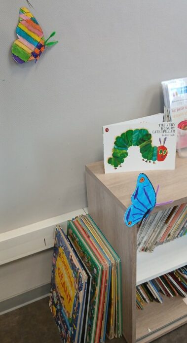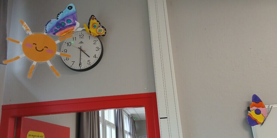 En lien avec notre élevage et l’arrivée du printemps, nous avons créé des papillons colorés pour décorer la classe :