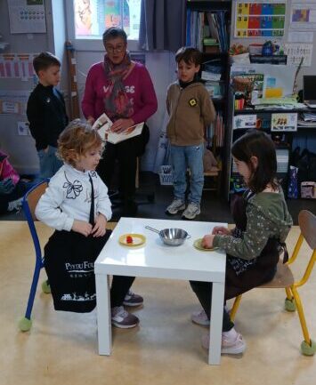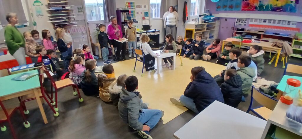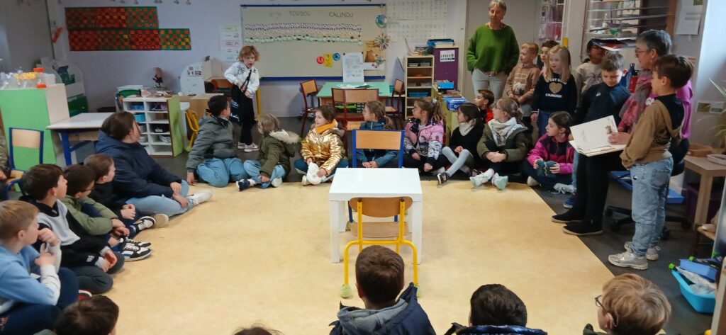 Nous sommes allés écouter une histoire lue et mimée par les élèves de GS de la classe de Carole. Le livre s’intitule: “Deux pour moi, un pour toi”. Dans cette histoire, un ours et une belette se disputent car ils n’arrivent pas à partager !