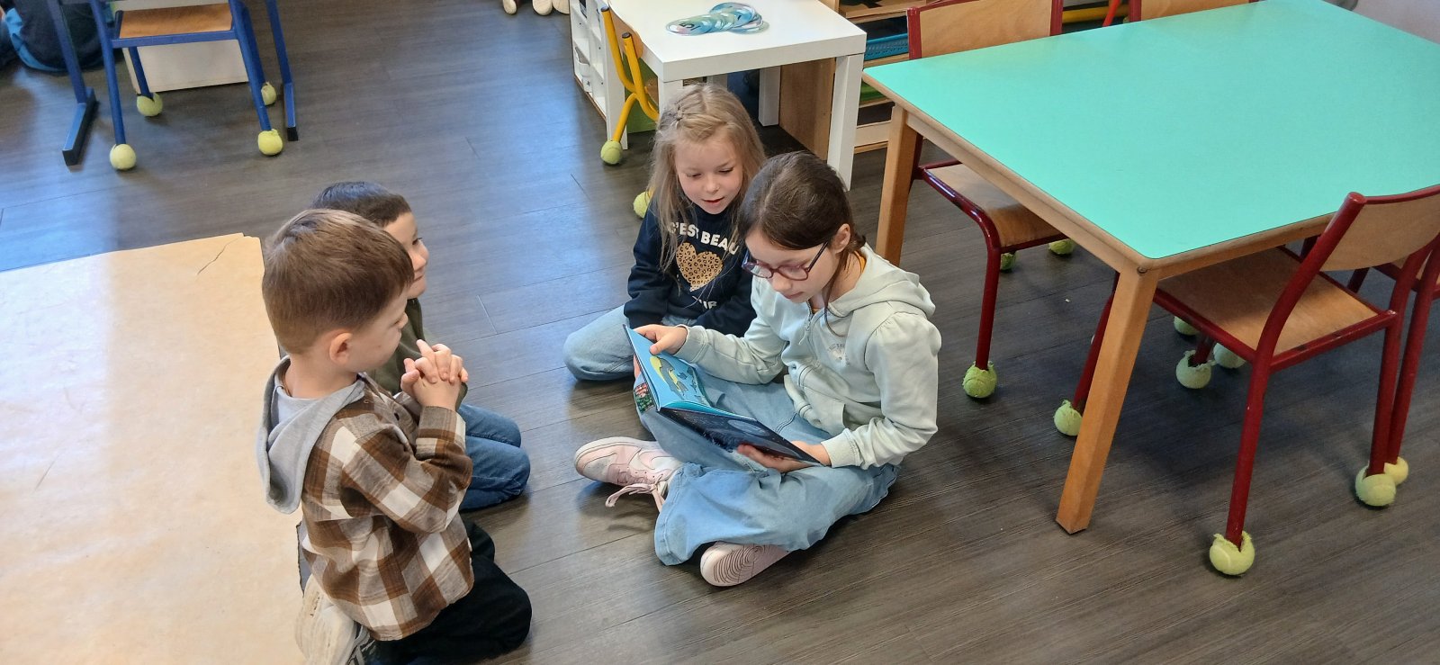 Ce matin, nos deux classes se sont réunies pour un temps de lecture partagée. Les élèves de maternelle nous ont aussi appris une chorégraphie pour retrouver notre calme !