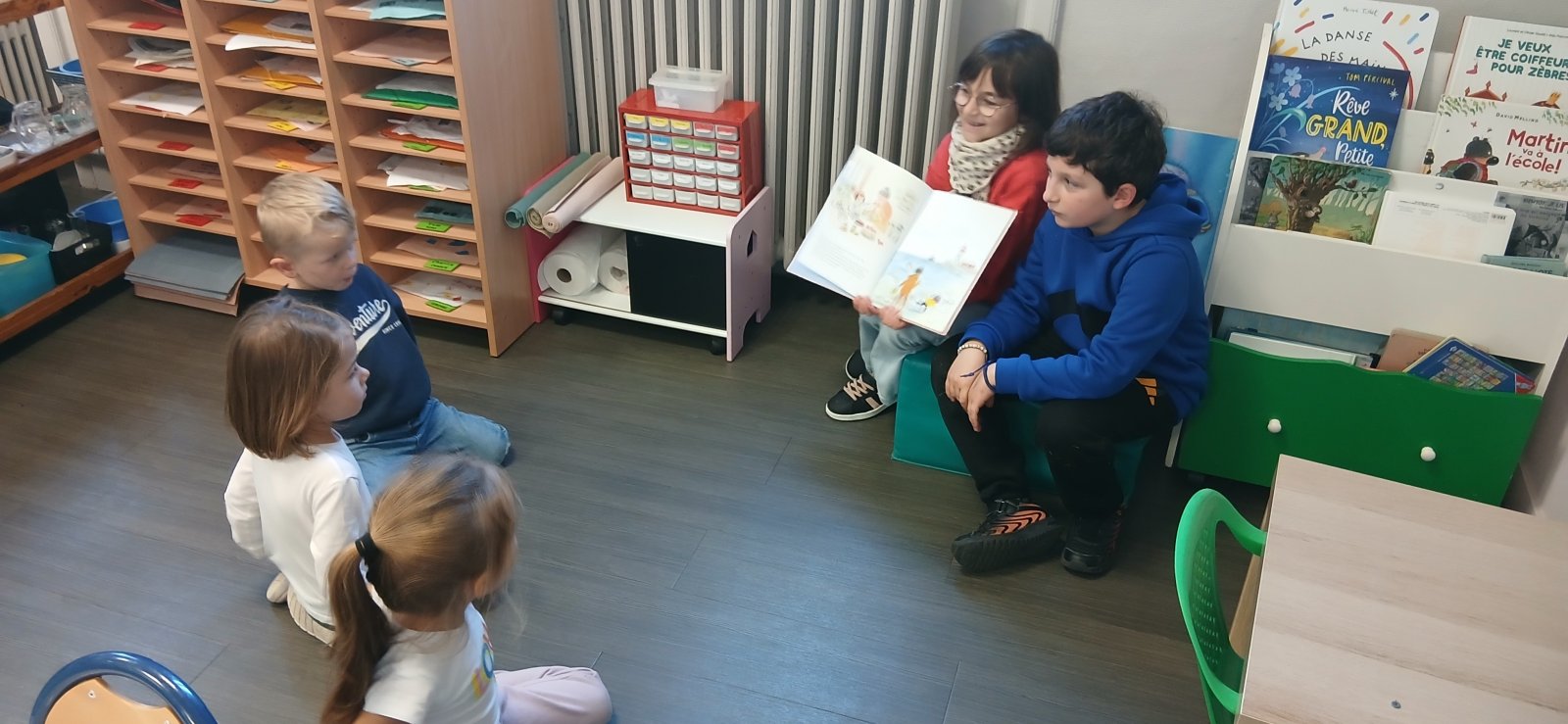 Ce matin, nos deux classes se sont réunies pour un temps de lecture partagée. Les élèves de maternelle nous ont aussi appris une chorégraphie pour retrouver notre calme !