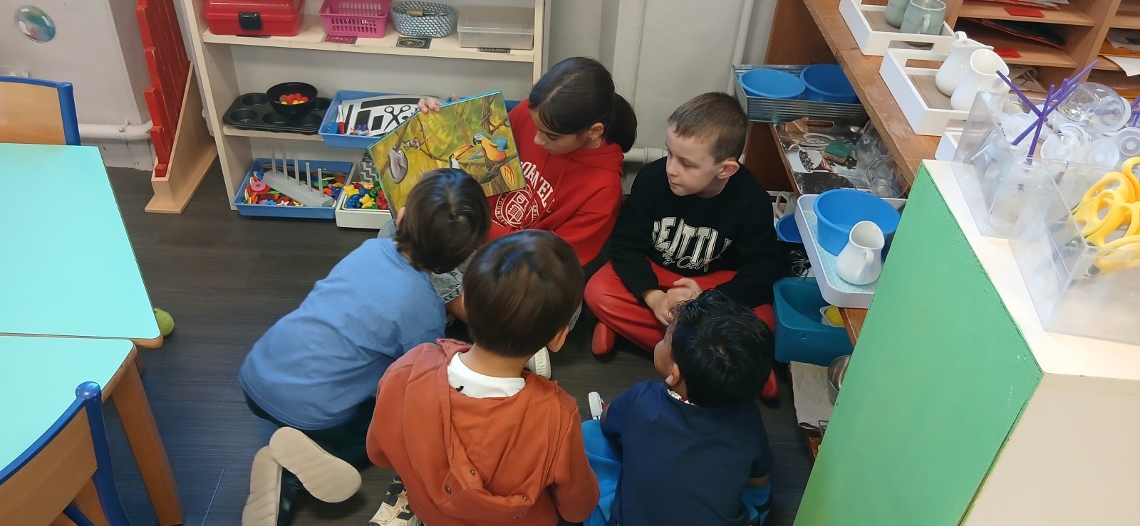 Ce matin, nos deux classes se sont réunies pour un temps de lecture partagée. Les élèves de maternelle nous ont aussi appris une chorégraphie pour retrouver notre calme !