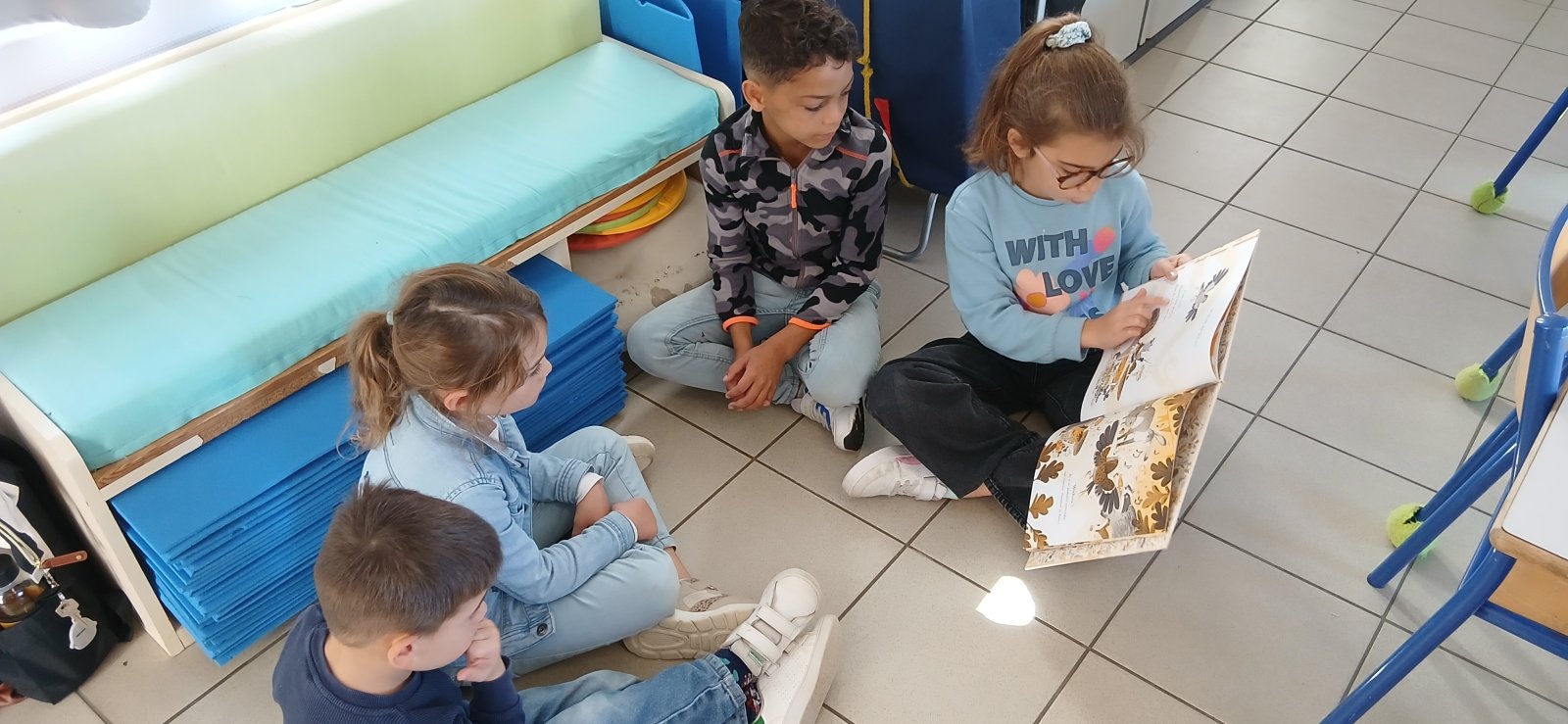 Ce matin, nos deux classes se sont réunies pour un temps de lecture partagée. Les élèves de maternelle nous ont aussi appris une chorégraphie pour retrouver notre calme !