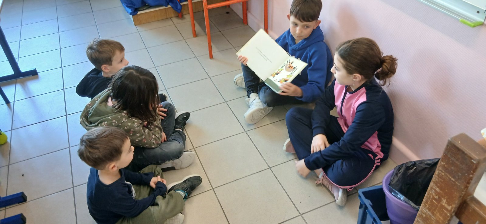 Ce matin, nos deux classes se sont réunies pour un temps de lecture partagée. Les élèves de maternelle nous ont aussi appris une chorégraphie pour retrouver notre calme !