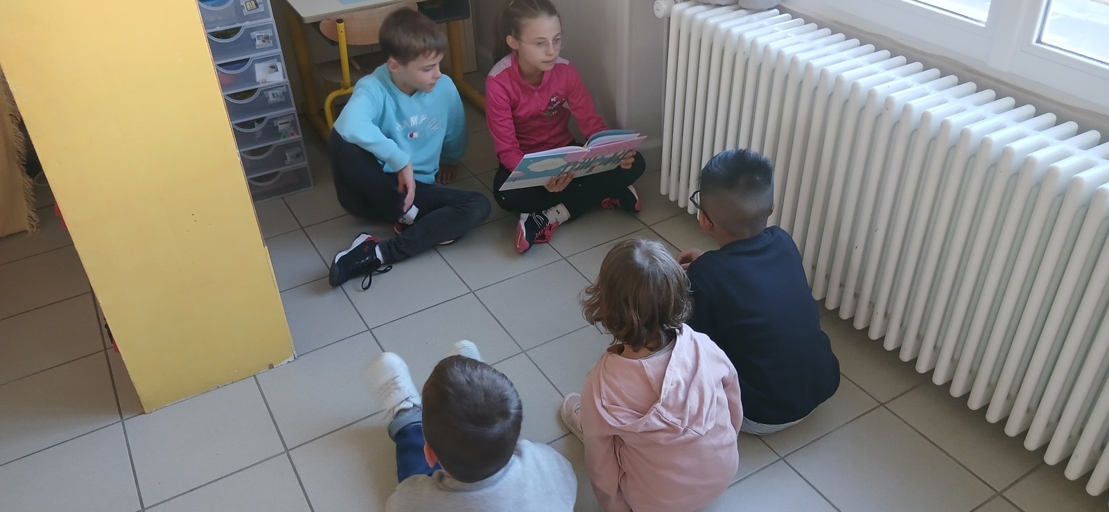 Ce matin, nos deux classes se sont réunies pour un temps de lecture partagée. Les élèves de maternelle nous ont aussi appris une chorégraphie pour retrouver notre calme !
