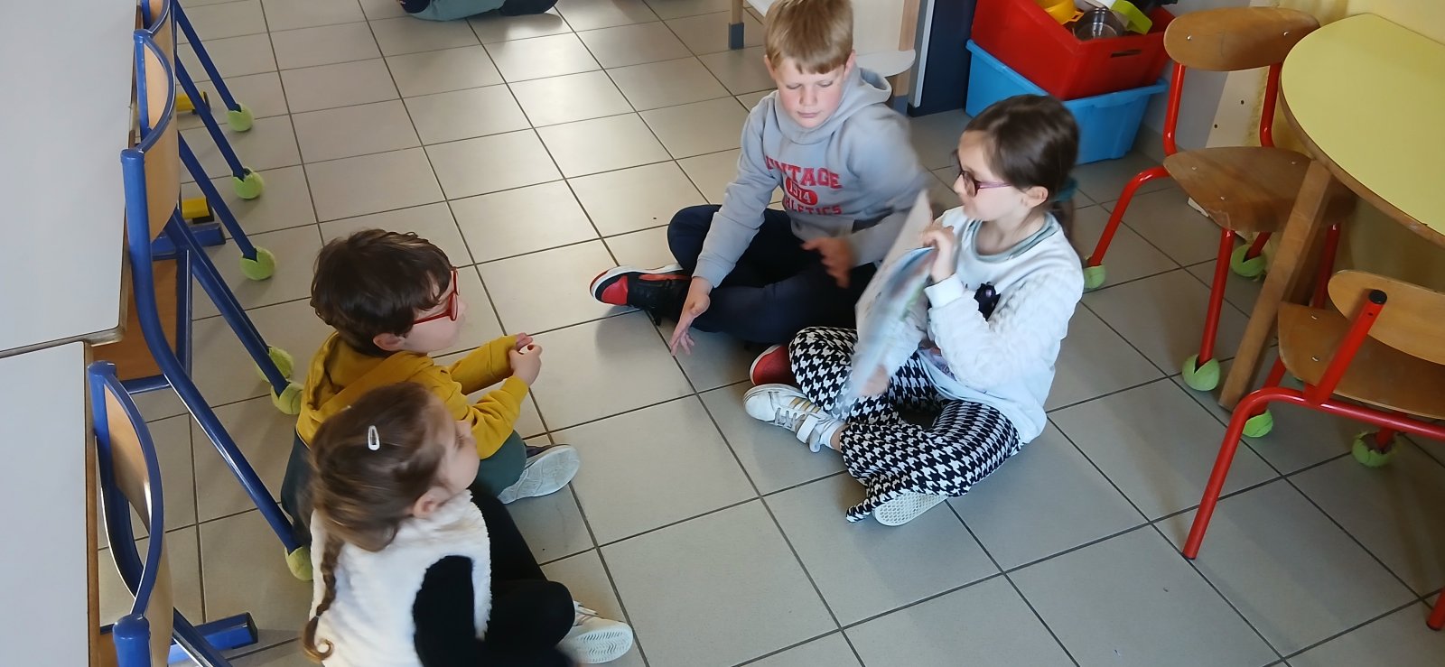 Ce matin, nos deux classes se sont réunies pour un temps de lecture partagée. Les élèves de maternelle nous ont aussi appris une chorégraphie pour retrouver notre calme !