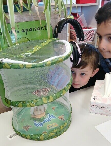 Ce matin, une belle surprise nous attendait dans notre filet : un papillon venait de sortir de sa chrysalide.